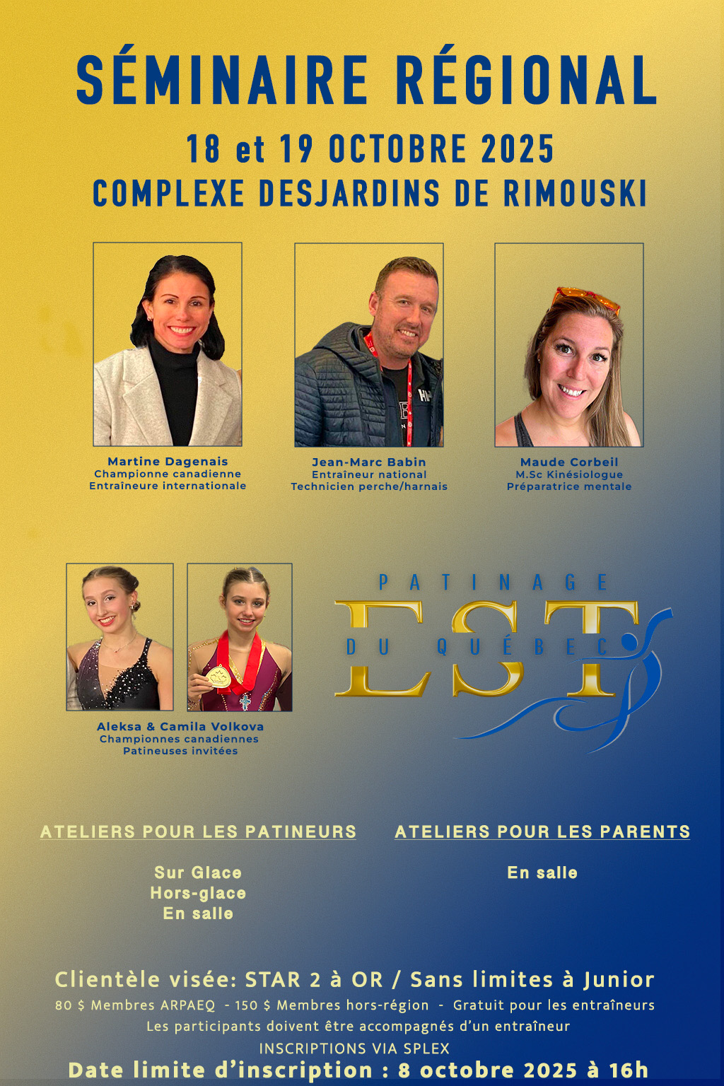 L’ARPAEQ organise un séminaire régional les 19 et 20 octobre au Complexe sportif Desjardins de Rimouski avec Mme Martine Dagenais, entraîneure de niveau international, M. Jean-Marc Babin, entraîneur national et Mme Maude Corbeil, préparatrice mentale.